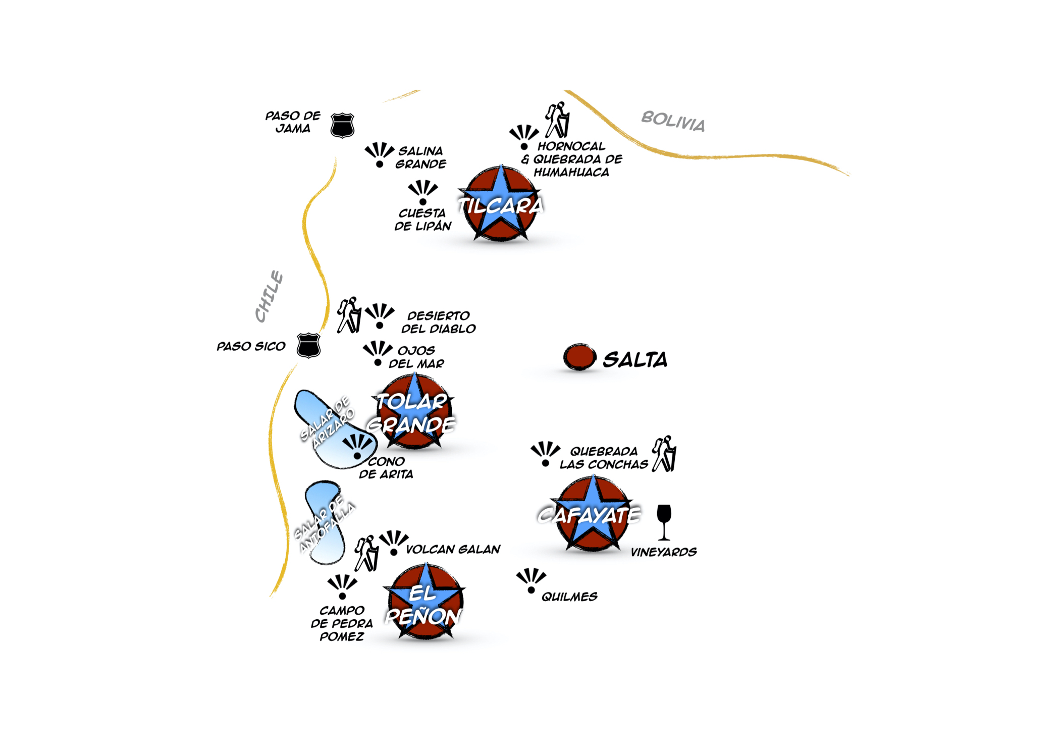 Highlights of the north-west Argentina where we travelled through are Hornocal, Quebrada de Humahuca, Tilcara, Purmamarca, Cuesta de Lipàn, Salina Grande, Salar de Jama, Laguna Ana, Quebrada de Mal Paso & Rio de las Burras, Salta, Cafayate, Quebrada de las Flechas, Quebrada de las Conchas, Quilmes, El Penon, Laguna Blanca, Karaci Pampa & Campo de Pedra Pomez, caldera de Galan & Laguna Diamante, Salar de Antofalla, Salar de Arizaro & Cono de Arita, Tolar Grande, Ojos del Mar, Desierto del Diablo & Las 7 Curvas, Salar de Pocito,...